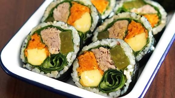 - 🥕 Main ingredients: Rice, carrot, pickled radish, and spinach — often without meat or egg.